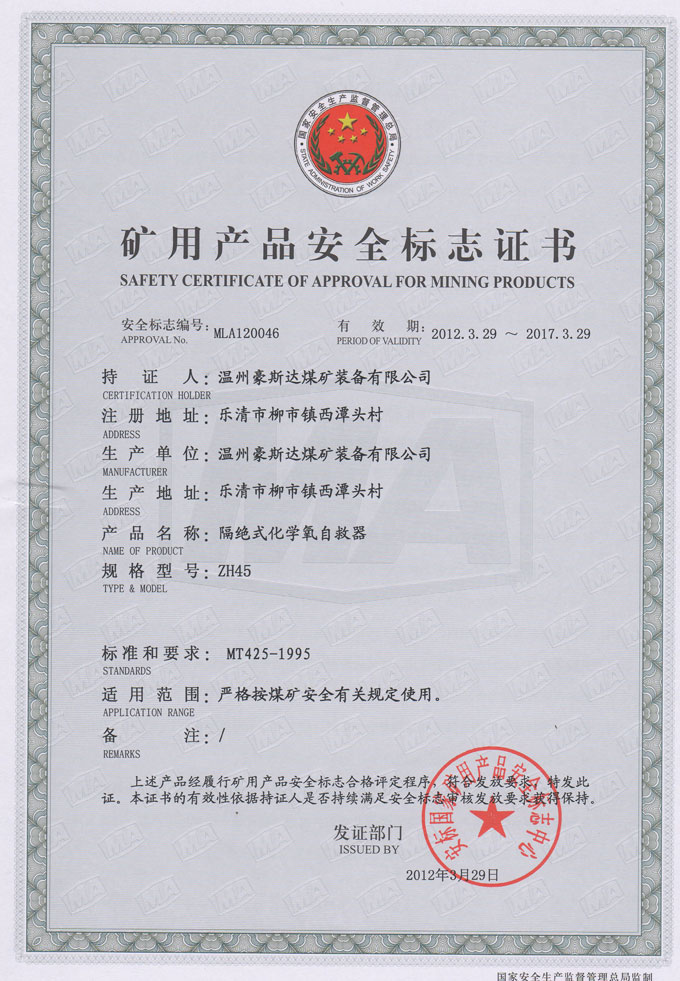 矿用产品安全标志证书ZH45