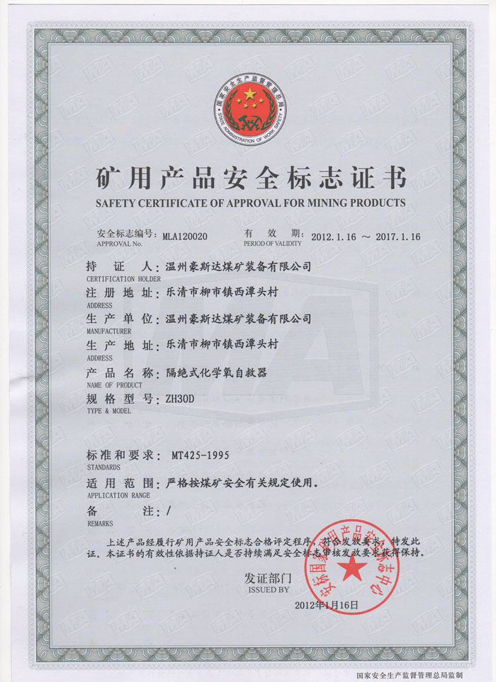 矿用产品安全标志证书ZH30D
