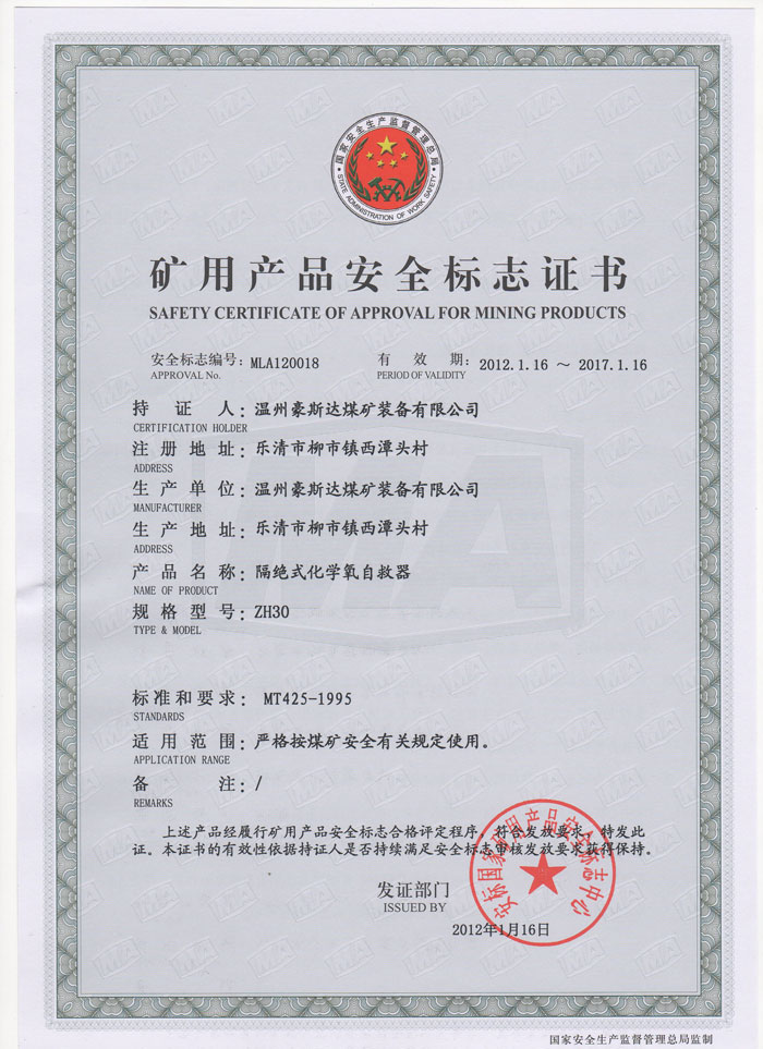 矿用产品安全标志证书ZH30