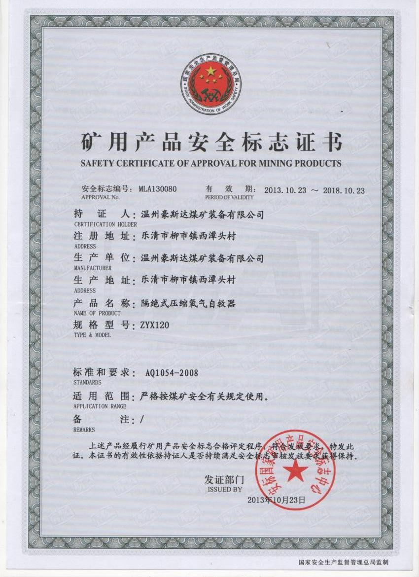 ZYX120矿用产品安全标志证书