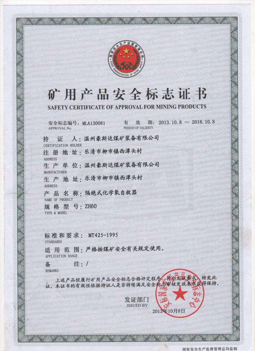ZH60矿用产品安全标志证书